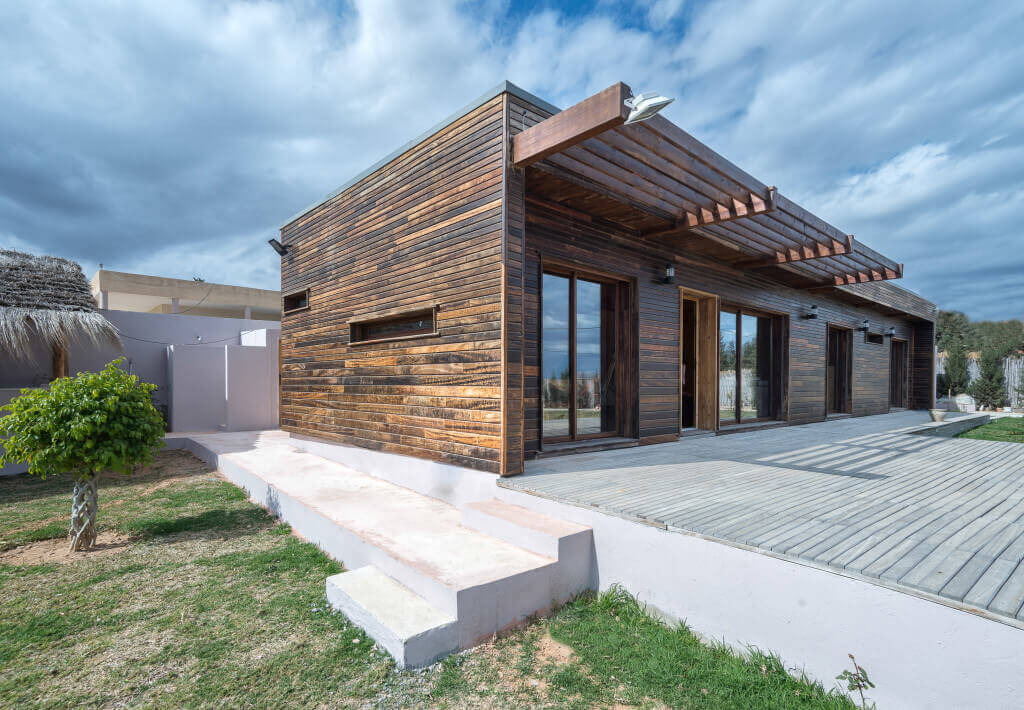 Maison en bois à modules superposés et transportables qui, une fois imbriqués, forment un magnifique T3. Elle présente un impressionnant porte-à-faux de 2,6 mètre. Grâce à ses grandes baies vitrées, cette maison est particulièrement lumineuse. Elle offre une vue imprenable sur la méditerranée..